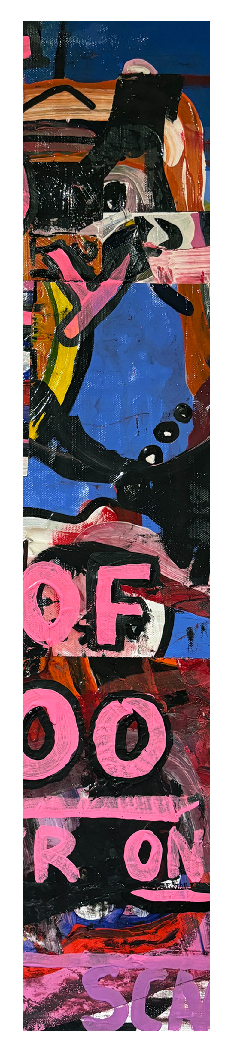 Follow the cutting guides and see where you land. Touch the crimson paint strokes and engage in a process of fetishised consumption, that can only be thwarted if illegal and immediate action is taken. Once again, consume the glossy surface, place your bare cheeks upon the land that colour forgot and dare to remember. Place your pinky into the blueish orbs of light and imagine they are cold to the touch, gently lapping at your forgotten limbs, dripping with crumbs of joy. This painting continues the scenario of mini-burgers / mini-islands / mini-chunks / mini-beasts / mini-caves of instantaneous colour, inviting you in and then repelling you with shouts of brokenness, limb aching pain and streams of dislocated colour that never fully reach their potential. Yellow, yellow, it all started with yellow...now it stops with gallons, no tonnes of sinew-cracked, panels of paint, clogging up your senses and awaiting the shop to close as its gone 6pm.