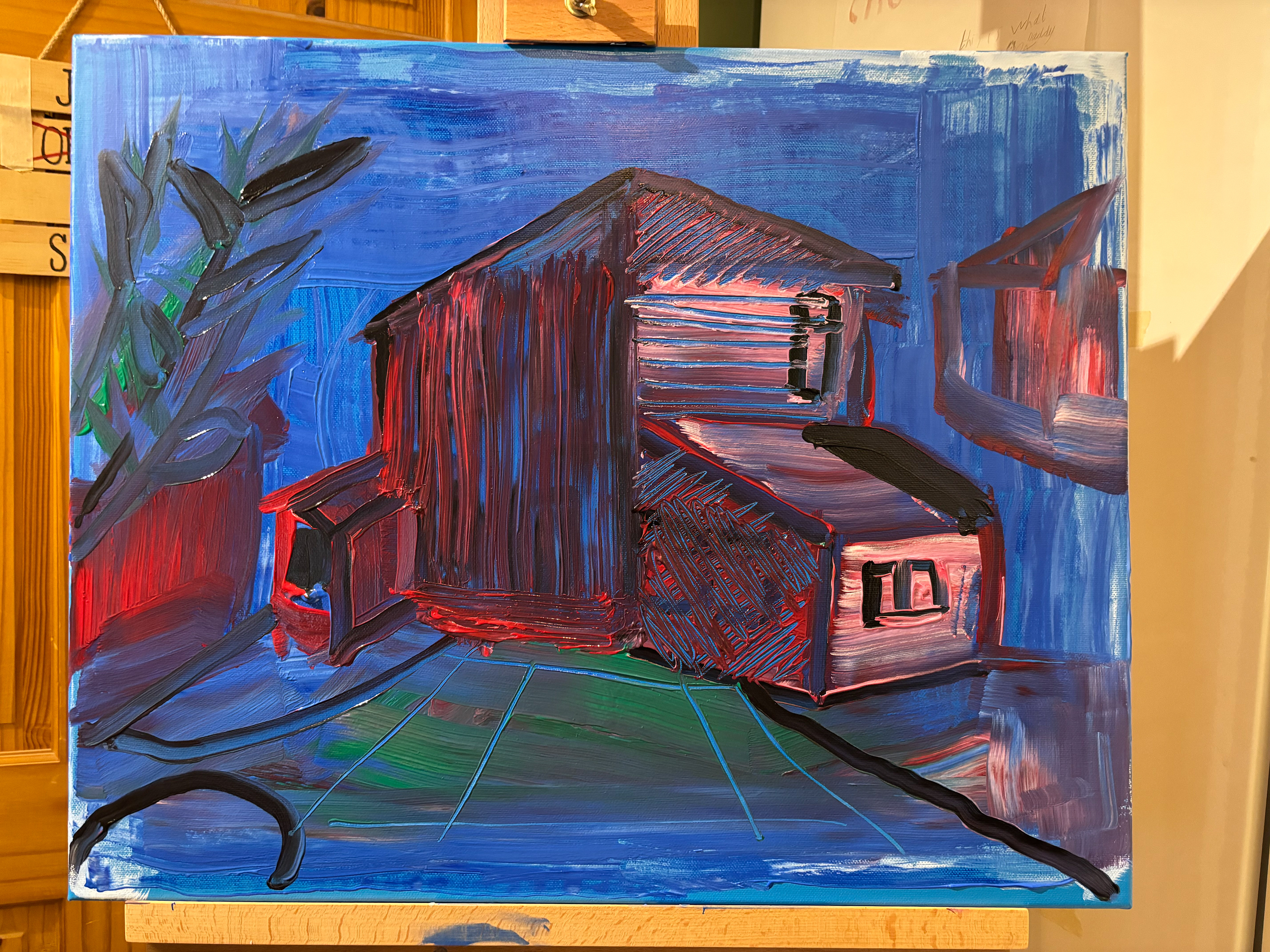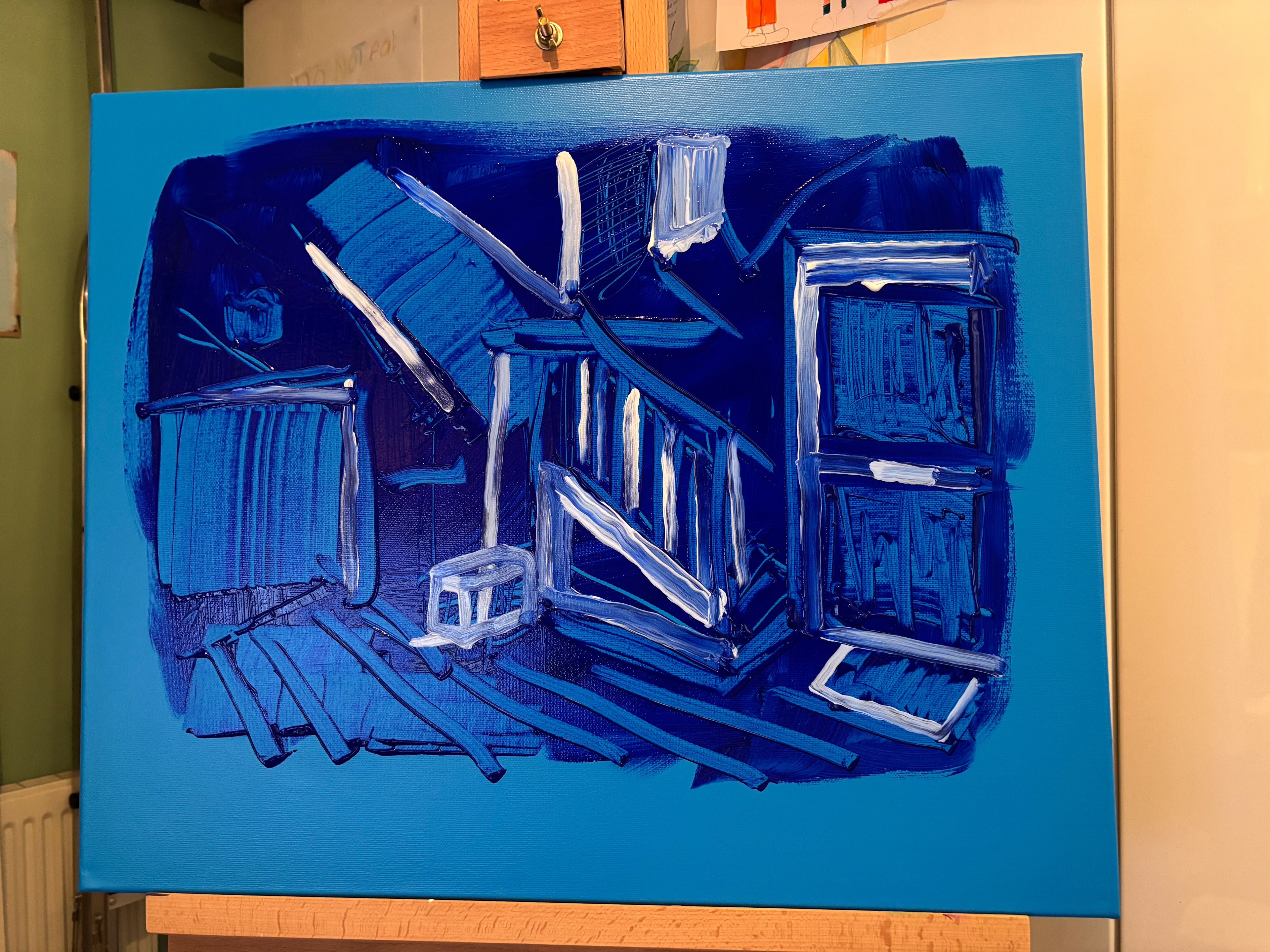 Constructing nonsensical statements that result in equally nonsensical images is the intention here. I'm enjoying the fact that the paintings simulate / replicate an actual digital process, in this case the operation of Ai, such as ChatGPT or co-pilot or more significantly, image generation Ai like Adobe Firefly. There is a comic-book aesthetic that I'm also interested in in terms of the framing of the information. Building on a linear narrative helps to reveal the initial intention/meaning of the work, making the immediate reading accessible/visible...which is ok, at this stage. Also deciding to use the white ground of the canvas starts to replicate the paper of a magazine/comic/graphic novel. The relationship between the parameters set and the image should be surprising, questionable and provoke a sense of disbelief or even confusion. The Ai has failed, the Ai has glitched (again) the instructions have not been followed, have not been 'computed' have been blatantly disregarded and the 'system' has gone rogue...
