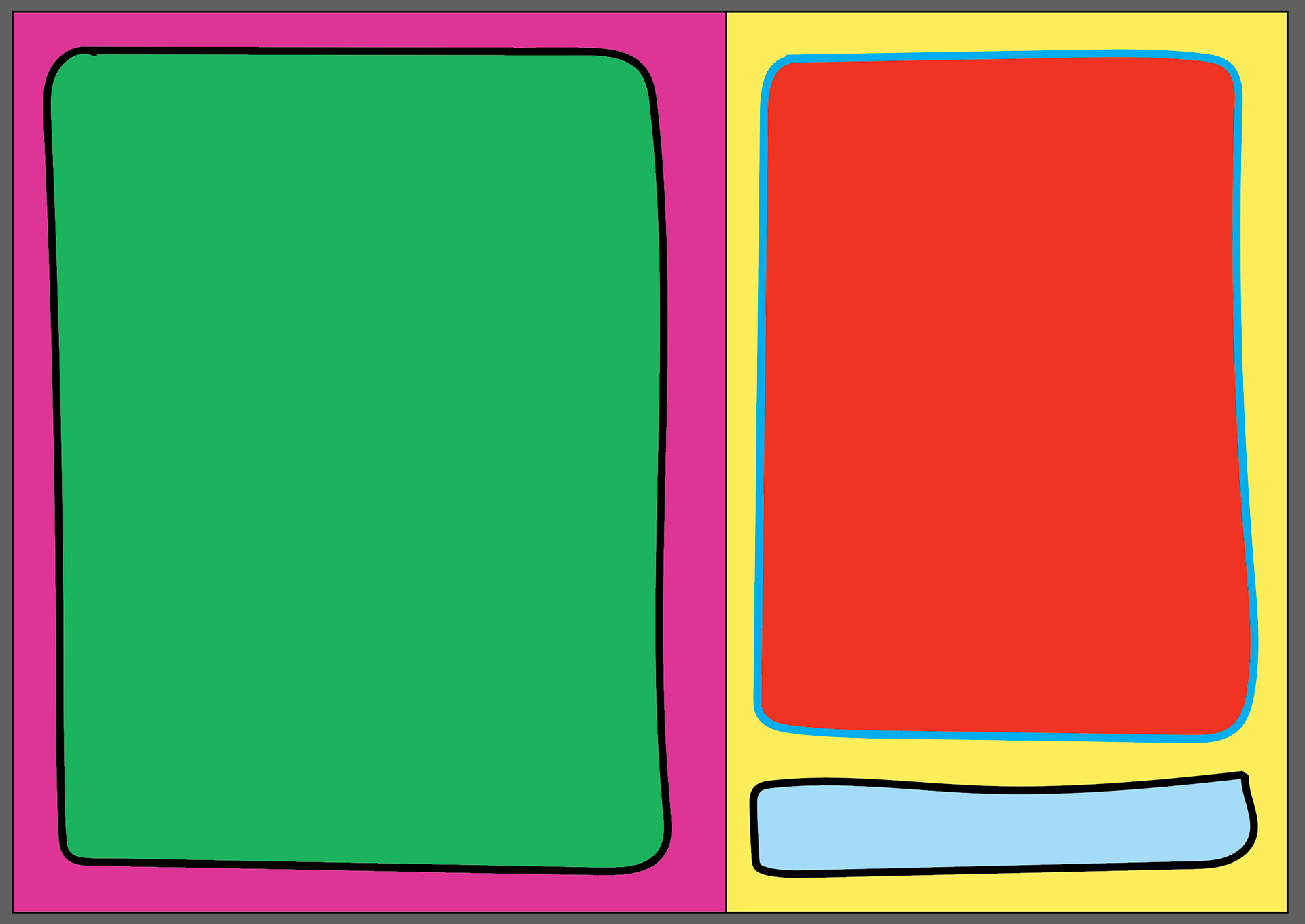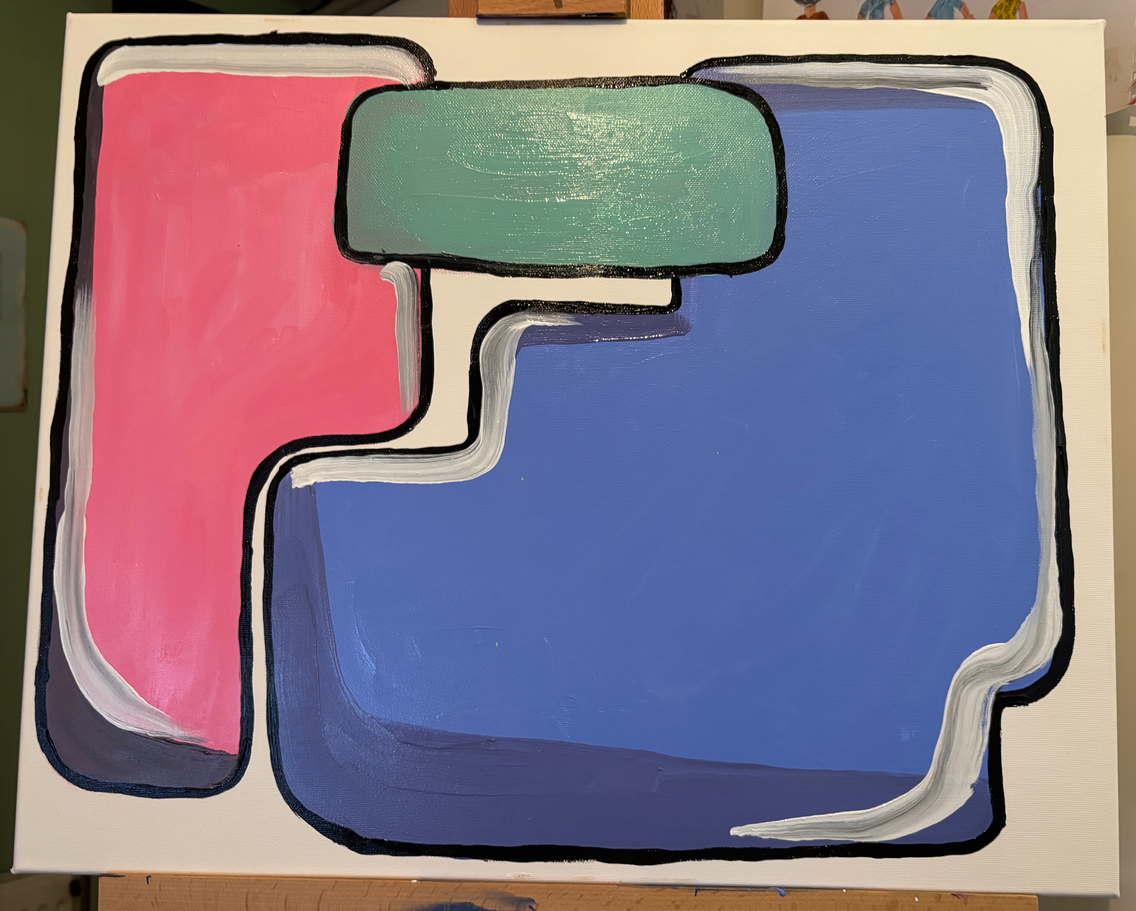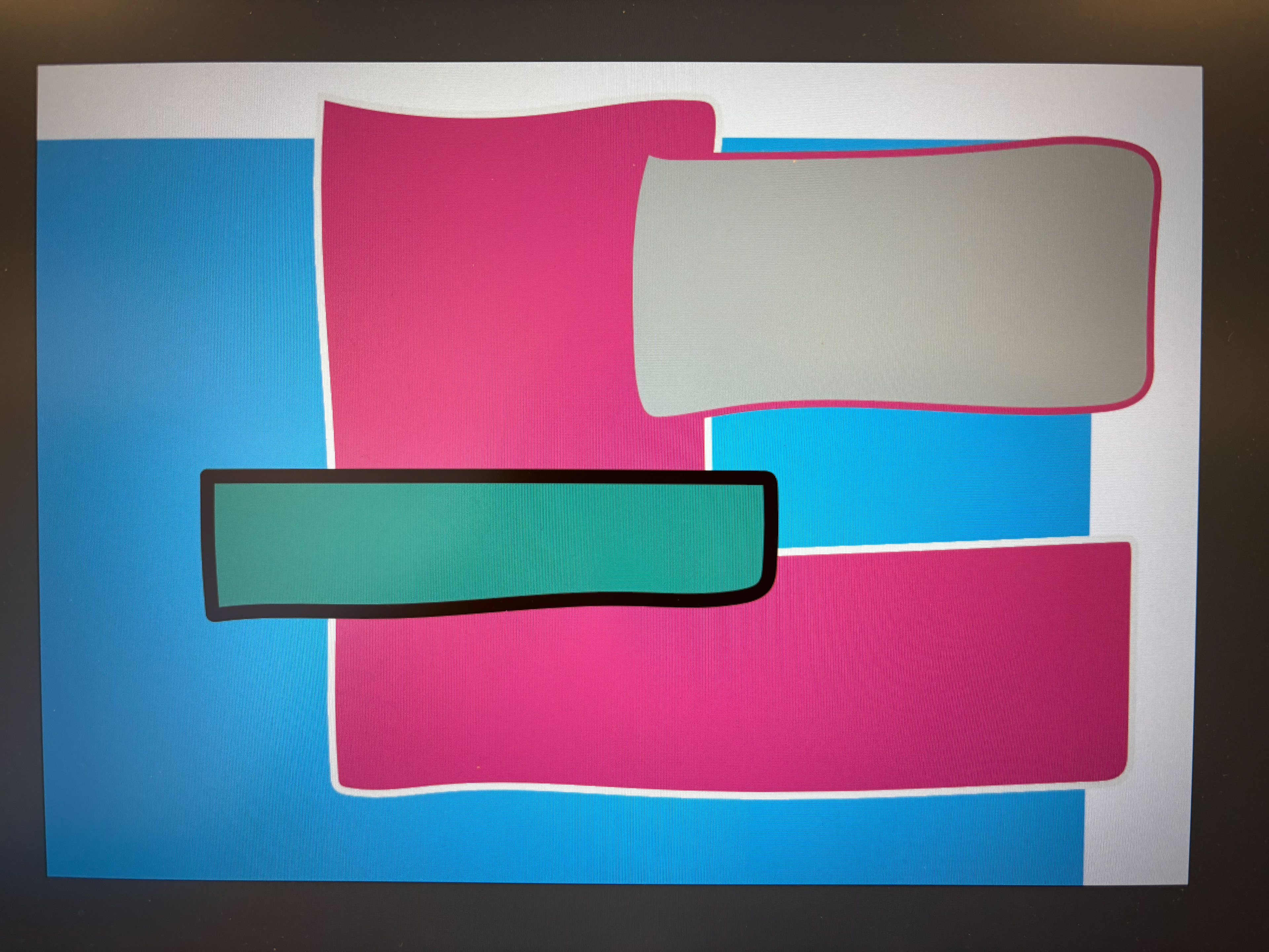 Four zones, one with the initial invitation, the second with the parameters, the third with the text: here you go, and the final zone is the image generation space, where the process has reached its conclusion and responded directly to the parameters set. Machine learning this is not, and the question is, what arse the dynamics at play here, within this piece and what type of piece is this...conceptual or informational, or instructional or humorous (or a combination of all of these aspects?) The colour zones (spaces) are starting to replicate adobe illustrator VECTOR cushions previously used in motion graphic pieces. Where slight shadow and highlights have been introduced. This is a change to the previous piece where spray paint was used to separate / divide the painting creating two distinct parts that behave differently and house alternative text. Within the first iteration there was a third zone that was left empty, as if a type of spatial glitch or digital zone yet to be occupied.