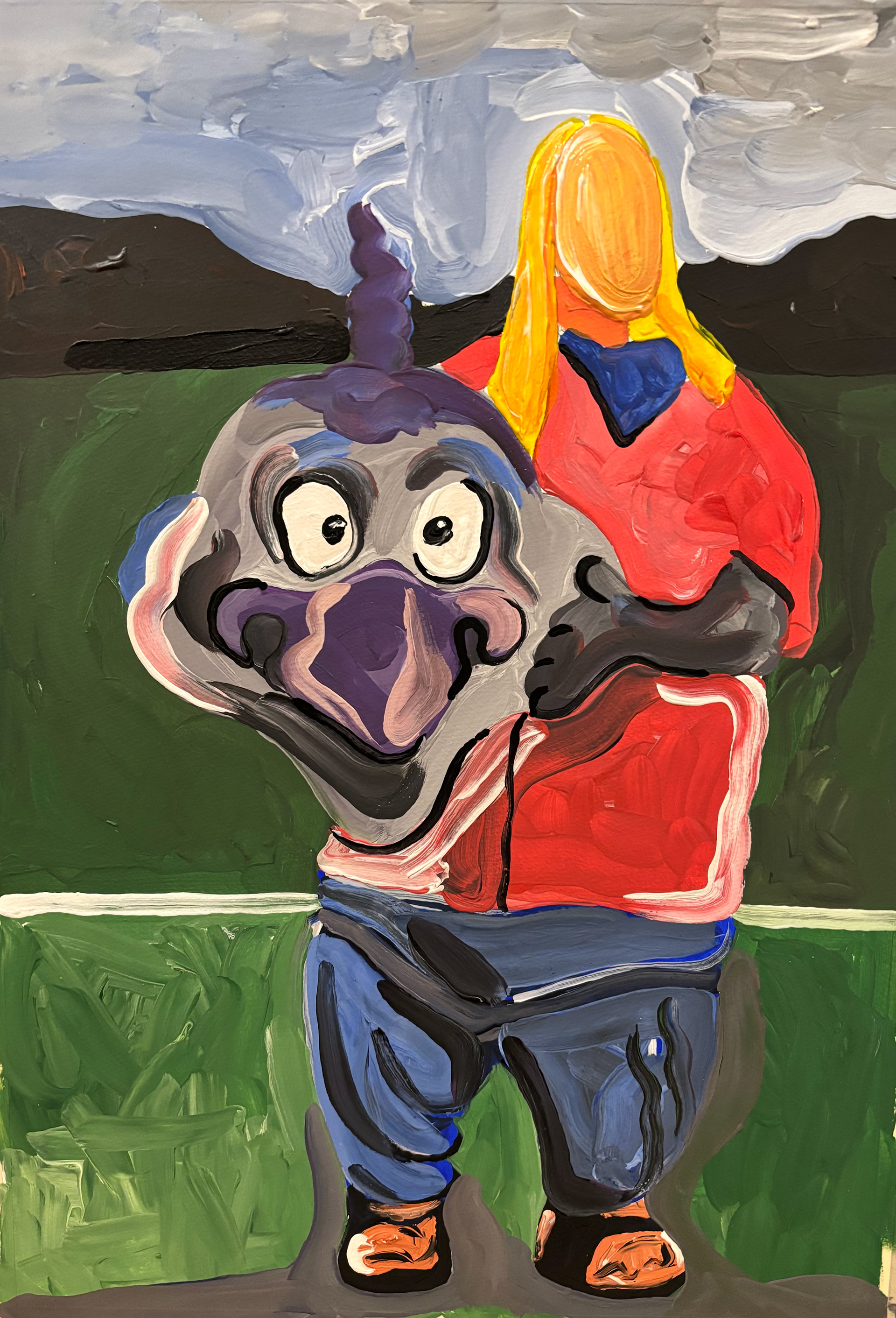 The current paintings explore mascot's de-masked. A person holding their own mascot head. Its playful whilst exploring the duality of a hidden and exposed sense of self.